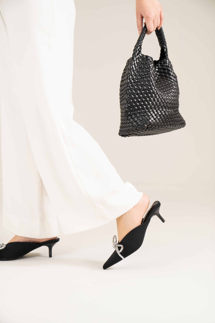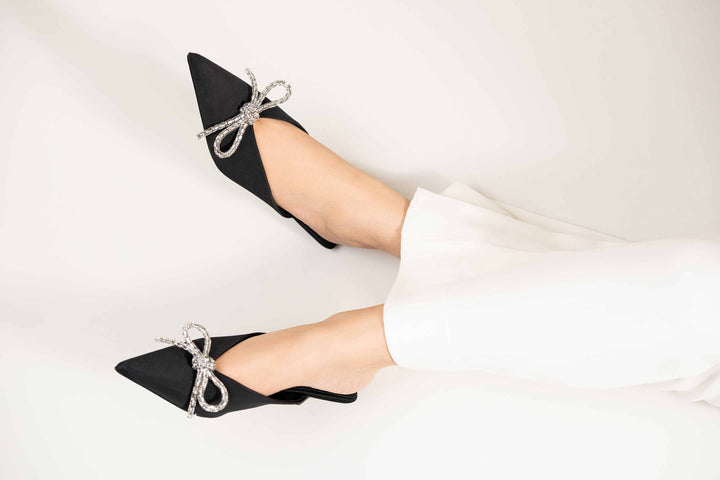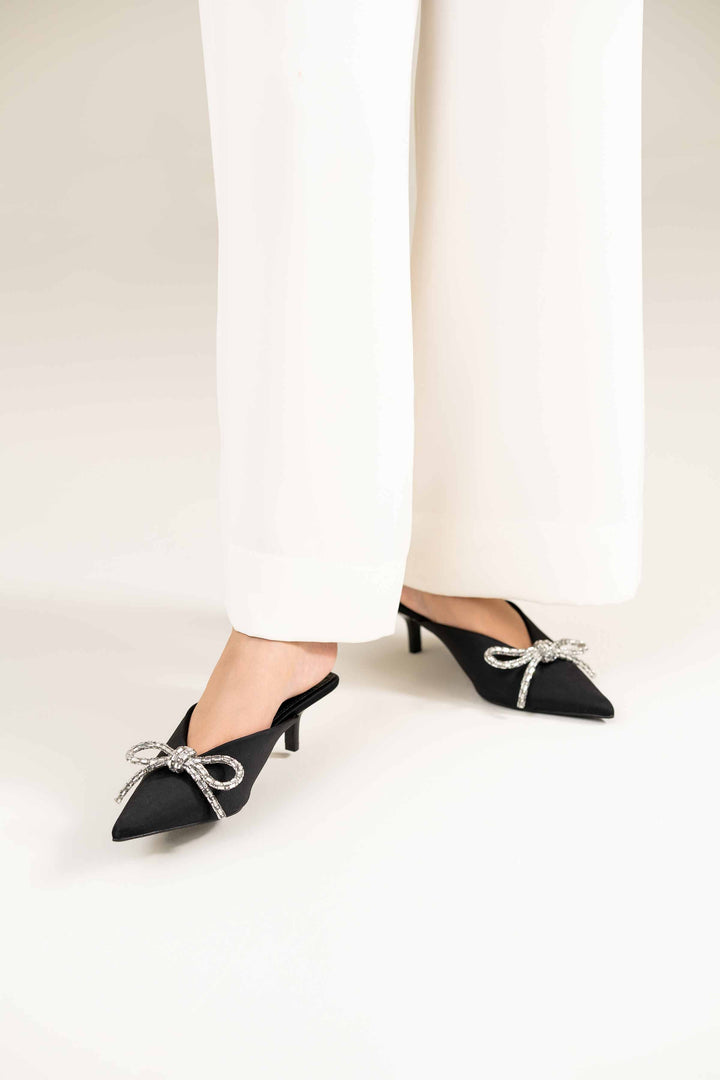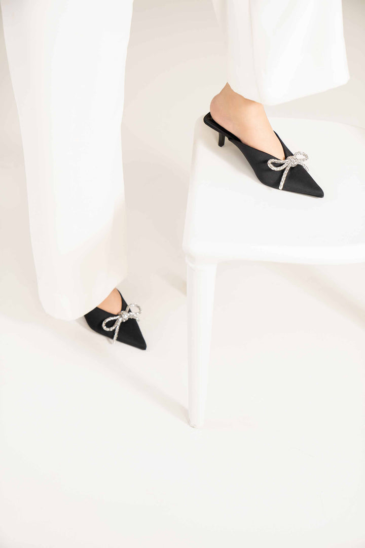 Elevate your look with these stylish back-open pumps adorned with small diamantes for a touch of elegance. Featuring a sharp pointed toe and a short pencil heel, they exude class while providing comfort. The padded insole ensures excellent comfort, grip, and a lightweight feel.