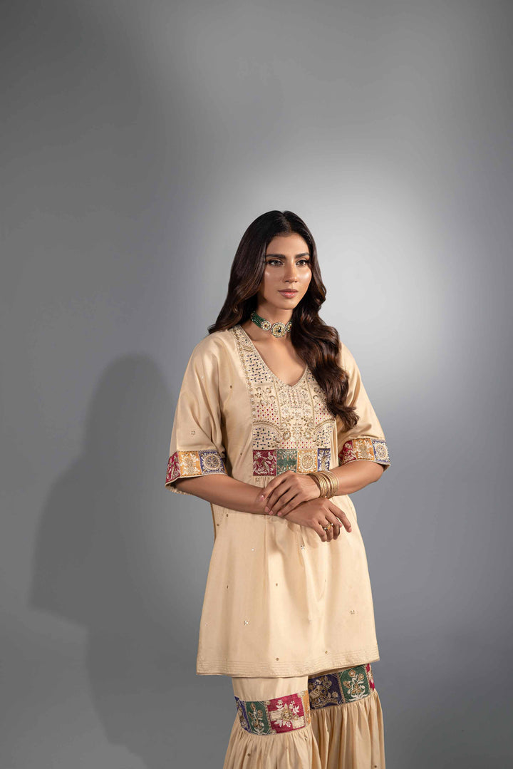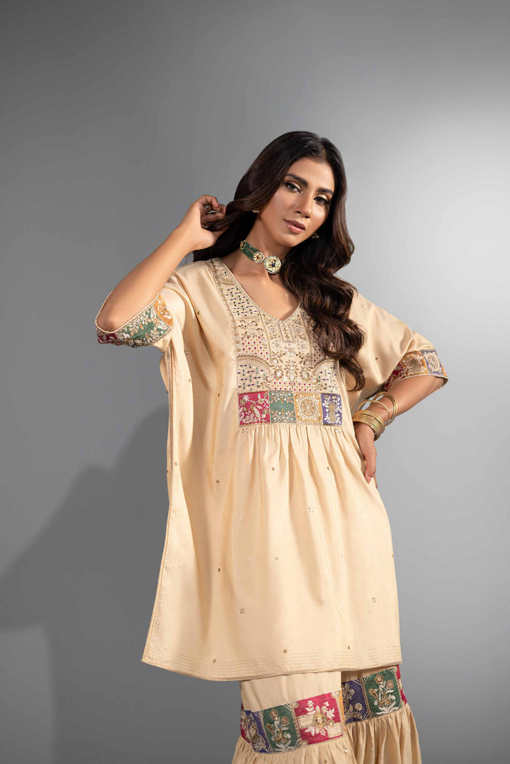 V Neckline With Tassels Detail, Embroidered Patti At Neckline & Sleeves, Yoke With Gathers Detail, Short Embroidered Kimono